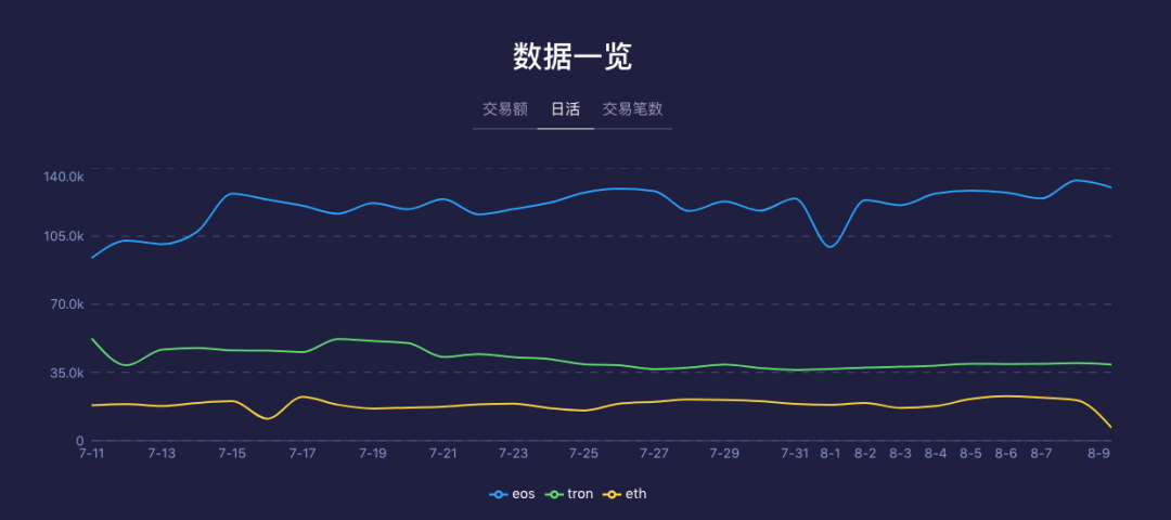 DApp即为Decentralized Application,中文名为去中心化应用。DApp定义是在去中心化应用里,玩家的操作逻辑需要跟智能合约进行交互。交易额的统计则是基于玩家与DApp交易的时候,发生合约交互产生交易的金额。目前从DApp整体生态数据中,绝大多数DApp基于ETH、TRON、EOS三大公链进行研发。其中,TRON和EOS上活跃度最高的品类为菠菜,ETH活跃度最高的品类为DeFi和DEX,少量重度用户占据了绝大多数交易额。基于EOS、ETH、TRON的APP交易额、日活与交易笔数(统计于7月11-8月9日)如下图所示: