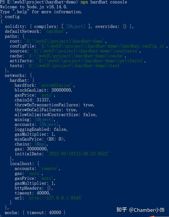 声明依赖的模块。 声明启动时执行的任务:在官方文档里面有更加详细的说明,这里的示例 task 的作用是:启动 Hardhat 时,打印出本地这条链的默认账户。 声明配置项:更详细的说明可以参考官方文档,这里说明一下常见配置的含义:
