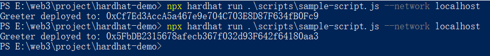 再执行一次 npx hardhat run .\scripts\sample-script.js –network localhost,会发现虽然是同一份合约代码,但是合约地址发生了变化: