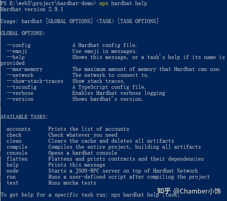 最后,还有一个重要的命令,叫作 npx hardhat help,这条命令会展示 npx hardhat 系列命令的用法:当你忘记的时候,就可以用这条命令查询一下。