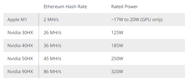 目前来看,M1 对哈希率影响不大。不过两者之间的差异可以归结于功耗,英伟达的显卡显然功耗更高,如果苹果的八核设计扩展到算力更强的设备,很难说苹果的 GPU 将如何「脱胎换骨」。近期也有报道称,苹果公司正在开发 128 核的 GPU,替换系统中 AMD 的显卡,或许不久之后就能和大众见面了。