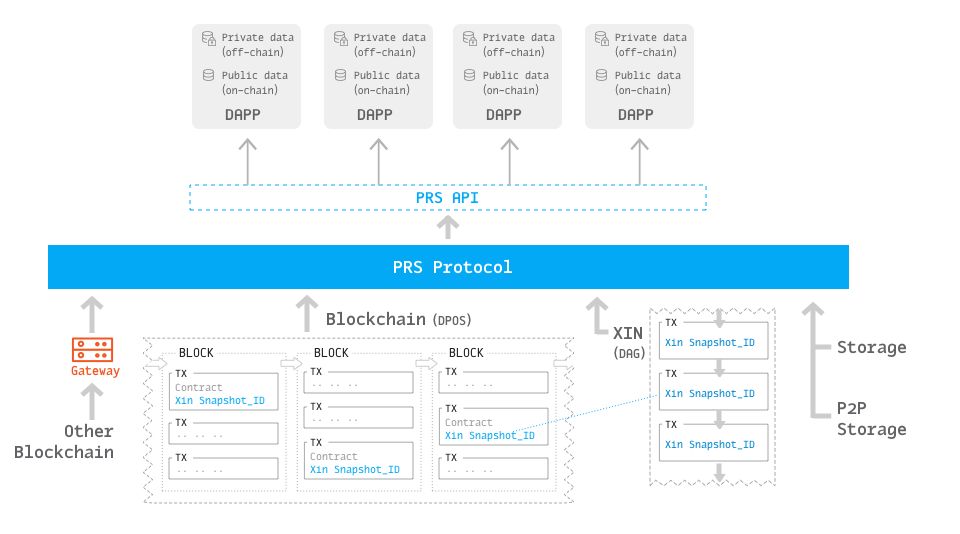 PRS链负责存储交易相关的元数据和进行智能合约的校验,并使用MIXIN network做为去中心账本来处理所有资产交易,而在内容数据方面可接入各种中心化云存储或去中心化存储,可以说即发挥了分布式系统的不可篡改特性又可以选择性的利用现阶段性能更优秀的中心化部分。