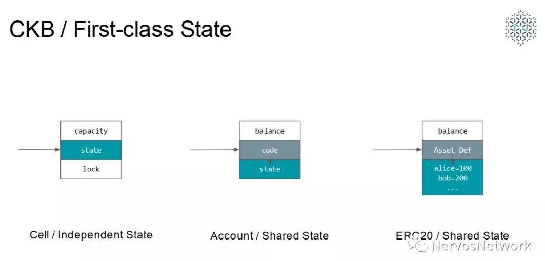 用户的资产相互隔离,用户资产状态独立。CKB 的经济模型关注状态存储激励问题:用户在区块链上保存状态不仅需要支付写入费用,而且应该承担与存储时间成正比的存储成本。如果用户的资产状态混合在一个地方保存(例如 ERC 20),这些状态的存储成本有谁来支付将是一个问题。(CKB Economics Paper 正在努力写作中…);