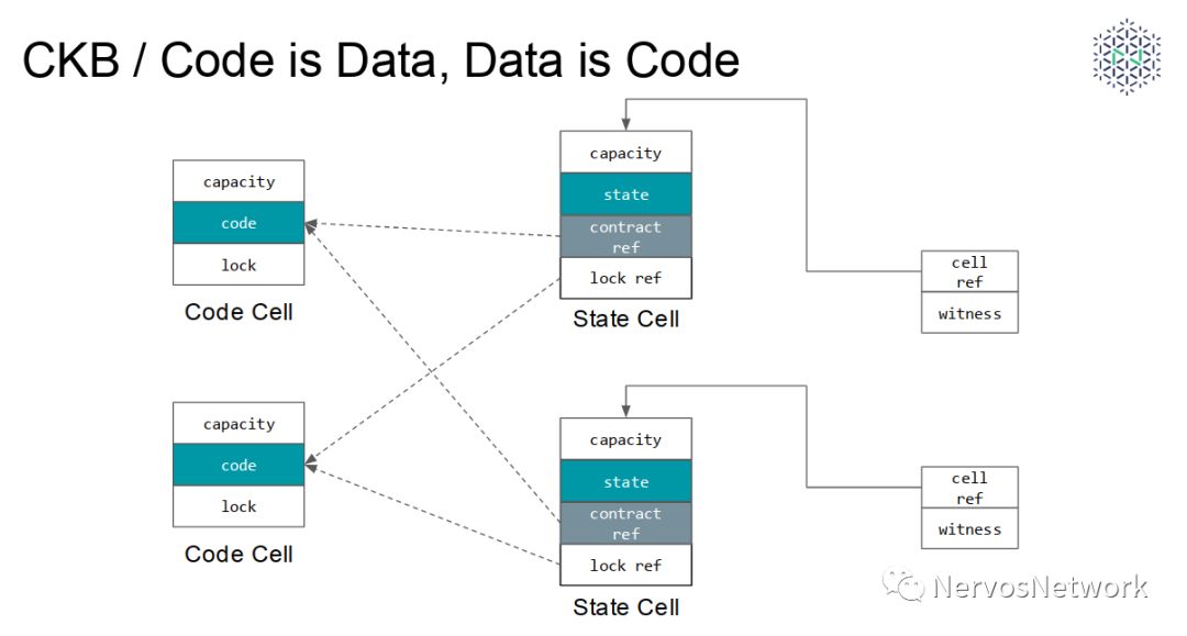 CKB 编程模型的另一个特点是,不区分数据(状态)和代码。这句话的意思是,与 Account 模型不同,合约的状态和代码都可以储存在 Cell 的 Data 字段中,保存代码的 Cell 可以被其它 Cell 引用(因为它们是First-class State!),合约的状态和代码不需要绑定在一起,存放在一个地方。开发者可以通过一条简单的指令把代码 Cell 或者数据 Cell 的内容载入运行时内存,然后根据需要自行将其解释为代码执行或者数据来读写。