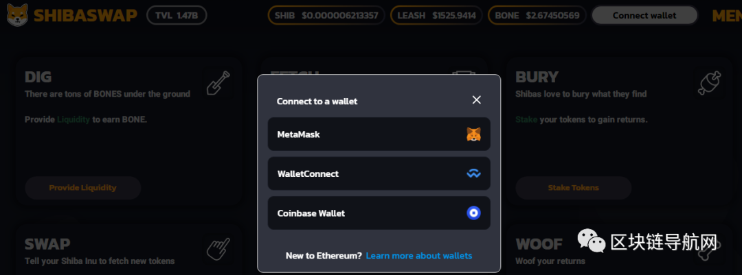 2,钱包里要备有一定的Eth币、Shib、Leash(狗绳)或Bone(骨头)币,如果没有这些币可在Uniswap或Shibaswap上购买;