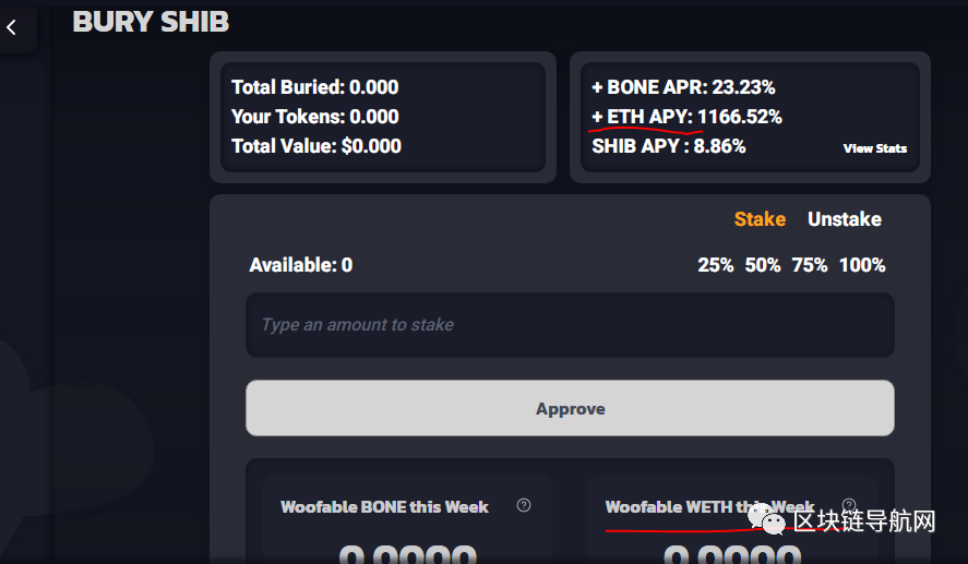 点击Bury Shib进来如下图,虽然质押Shib挖Bone的收益最低,但是与Leash和Bone不同的是:质押Shib还有额外手续费分成