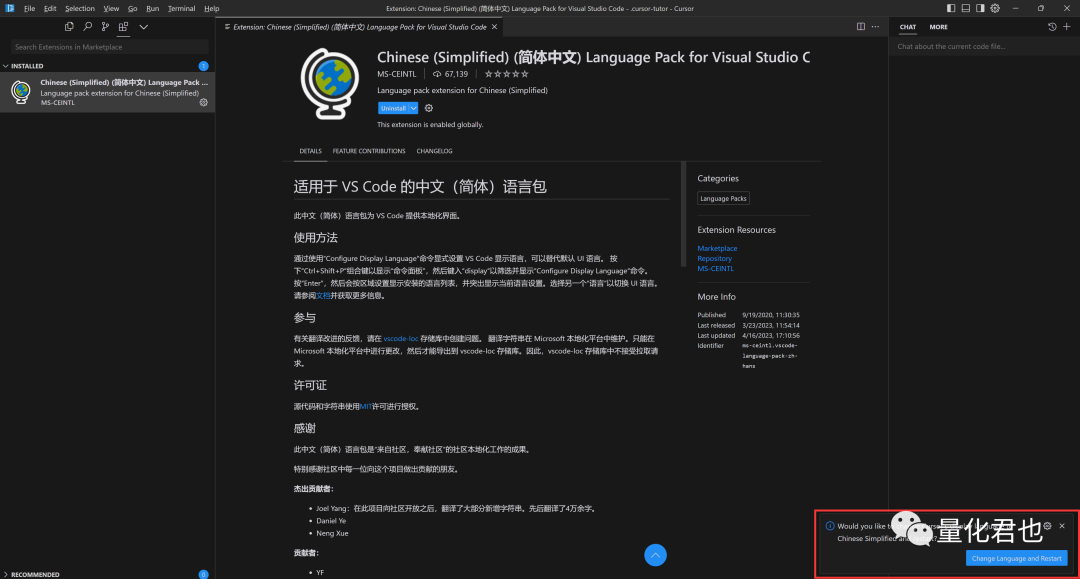 插件安装完成后,会在主界面右下角出现弹框,点击“Change Language and Restart”蓝色按钮。