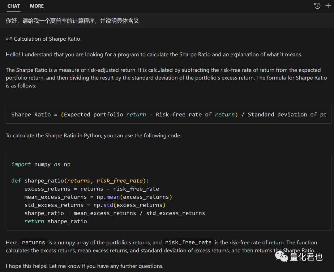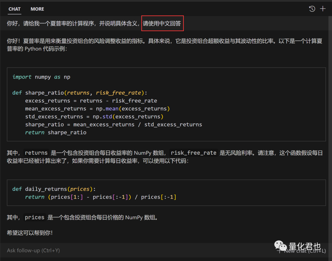 打个比方,咱让Cursor写一个夏普率的计算程序,它用英文来回复。