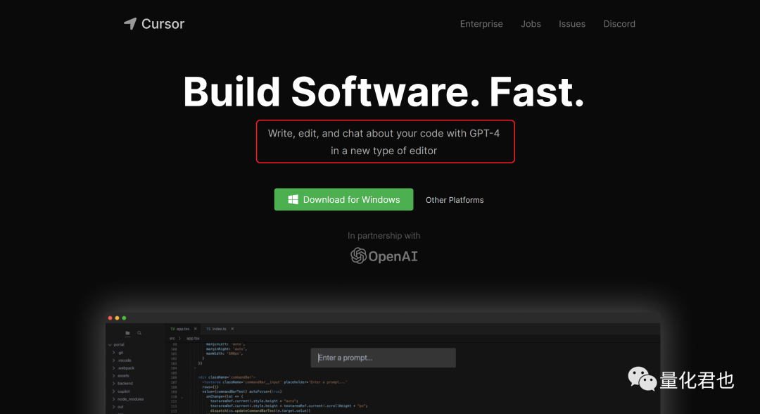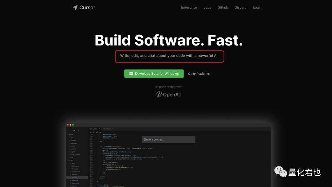 登录官网,虽然总体跟以前的风格大致一样,但是细心的小伙伴会发现slogan口号“Build Software.Fast.”下的那行小字发生了改变,官网地址:https://www.cursor.so/。