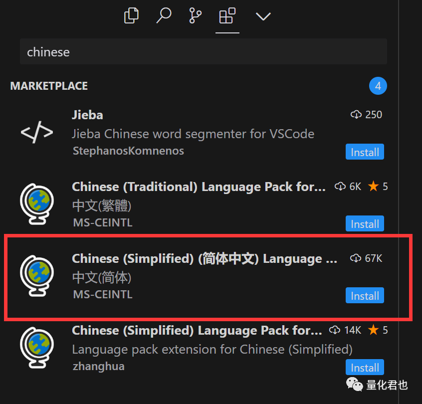 在弹出的商店搜索框当中输入“Chinese”进行搜索,选择简体(简体)语言包插件,点击右下角蓝色Install按钮安装。