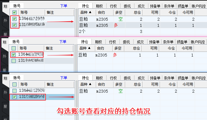 账户持仓查询可以点击右下角【期货户】调出下单主窗口,全部勾选可查看整体持仓情况。左侧账号列表分别勾选不同账号,查看各个对应账户持仓情况。