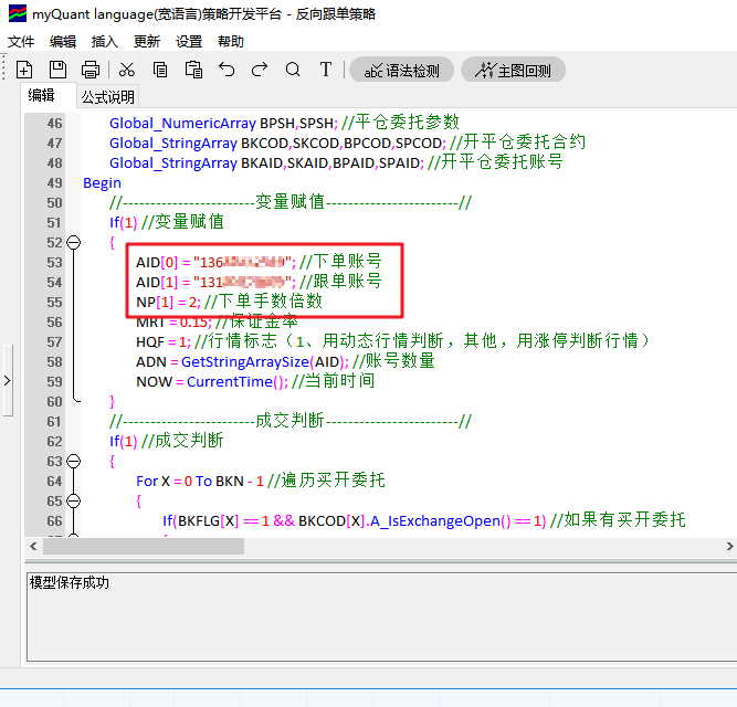 软件右上角->【量化】->【策略开发】中根据需求编写跟单策略源码,源码中需要将跟单模型里填写下单账号和跟单账号写入,案例跟单策略采用反向跟单,并且可以设置跟单手数*倍数,此时下单倍数填写2倍编写。编写完成后做语法检测并保存。