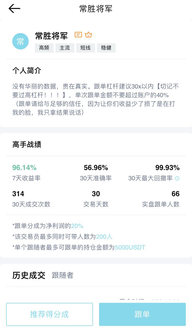 “下午三点钟,晚上零点后到一点,关注COMP 3S。”“BAL还能玩吗?”“可能不太适合,昨天刚开始好玩。”这是哔哔News加入的某交易所个人IP(分析师)群,群主在给群成员提供关于最近比较火的DeFi代币的操作建议。这个群很活跃,平均每天都有上百条聊天消息,社群成员对群主的操作建议和分析比较信任。哔哔News印象最深刻的是3.12暴跌期间,这个群几乎24小时处于活跃状态。3.12期间,ETH和BSV等币种曾在短时间内有过非常大的跌幅,当时有成员在群主的建议下,用三倍做空KSM的利润在暴跌前三倍做空BSV,获得了可观的收益。1合约跟单需求以上就是加密合约市场比较典型的一种跟单场景——社群KOL给社群成员提供一些短期的操作建议,包括币种、时间、方向、杠杆倍数等。所谓跟单,是指新手复制专业交易员的操作,交易员怎么买,怎么卖,怎么加杠杆,新手也跟着做,有一点“老手带新手一起吃肉”的感觉。其他比较常见的跟单方式还包括:一些知名交易员发起收费或者免费社群,带小白做交易;一些行业KOL向散户筹资做操作,利润与散户分配;还有一些交易所推出的自动跟单功能等。这几年,衍生品交易已经发展成为交易所的必争之地,也有非常多的小白用户涌入到这个市场,但是因为缺乏一些基本知识,也因为行业鱼龙混杂,小白缺乏避坑的经验,他们常常会成为爆仓和被割的对象。因此,如何更好地做投资风险管理,如何更快地抓住行情机会,如何在实操的过程中理解市场逻辑,如何通过靠谱的投资赚到一些收益……是新手投资者非常关心的问题,新手投资者也非常需要有经验的交易员带着他们做投资操作,“优质跟单”有很大的市场需求。2XMEX一键跟单,用户和交易员双向受益如果你仔细观察就会发现,目前已经有不少交易所或者第三方平台上线了跟单功能,比如币Coin、合约帝、XMEX、Bitget、Bingbon等,而相对于第三方跟单平台,交易所跟单存在不少优势。第三方跟单平台往往对接多家交易所API,因为受制于其他交易所的API通道,有数据和操作延迟的风险,而且此类交易所需要提前付费订阅后才能查看到交易员的操作记录。以XMEX为代表的交易所一键跟单,是将跟单功能直接开发到了APP中,实现了功能上的连续性,数据不会产生延迟;再者,交易所自动跟单往往是采用先跟单,盈利后再分成这样的模式,机制更加公平,用户不再处于劣势。1)XMEX跟单功能优势哔哔News研究了XMEX上的自动跟单功能,发现其有这样几大优势或特点:交易员严格审核(尽可能筛选出优质交易员)、交易数据透明、用户资金安全、分成机制公平、用户权限自由,交易员和用户利益能达成一致。在XMEX上,用户要成为交易员需要经过XMEX的审核,平台对交易员的交易额、交易频次、胜率等都有要求,此外,交易员数据全部来自XMEX实盘,带单和跟单记录完全没有隐藏或者修饰,平台也规定一个交易员只能注册一个带单账号,因此,交易员质量得到了最大程度的把关。在跟单社区界面中,无论是跟单用户还是未跟单用户,都能看到交易员数据,包括交易员操作风格画像、收益率等等,非常方便用户筛选出适合自己的带单老师。此外,这一界面的交易员排名是以七天收益率为依据,能够最大程度地反映出交易员当前的真实交易实力。针对不合格的交易员,XMEX表示,一方面,这些交易员的数据指标会下滑,他们本身的跟随用户会减少,另一方面,XMEX也会下调他们的分成比例,或者直接将他们踢出跟单社区。XMEX对于交易员的激励机制则保证了交易员与用户利益达成一致。在XMEX上,交易员能从用户盈利中获得10%或者20%的分成比例,扣除平台和用户推荐人的抽成,交易员分成比例在7-19%不等,并且各方分成比例早已在系统中设置好,公平透明。其次,XMEX并不设置交易员返佣机制,可以避免交易员通过高频操作来薅用户手续费的羊毛。在跟单的过程中,用户资产也得到了最大程度的保护。用户资金始终不离开账户,交易员只为用户提供交易信号而不接触跟单资金,能避免交易员拿钱跑路和操作不透明的问题。而最值得注意的一点是,跟单资金和交易的主导权始终都在用户这边,一旦用户对当前交易员操作不满意,可以随时停止跟单或者手动平仓。以上种种杜绝了交易员的作恶空间,同时能激励交易员通过提升交易实力来进行最佳投资操作,为自己,也为用户赢得收益。因此,XMEX是一个能实现交易员与用户共赢的平台,平台跟单功能透明公正,不存在吃客损问题。2)跟单操作指南那么,XMEX的跟单功能到底怎么使用呢?在进行跟单操作之前,用户首先需要确保跟单账户中有足够的保证金。跟单社区向用户展示了交易员信息,包括交易员风格画像、收益率、最大回撤率(回撤率越高,交易员交易风险越高)、跟随者数量、利润分成、带单记录等等,用户可以根据自己的风险偏好和交易习惯选择合适的带单老师。