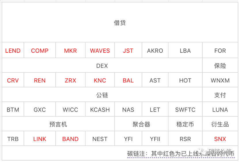 代币单价一度超过比特币的项目 yearn.finance 创始人 Andre Cronje 曾表示,其对 DeFi 代币上线中心化交易所没有兴趣。并且 Andre认为,DeFi 已经覆盖了除法币入金渠道以外所有中心化交易所能完成的事。这自然是去中心化世界的远景,是一个理想中的全新世界。不过,少数极客们的理想,与实际情形可能就是两回事了。在中心化交易所宣布将上线 YFI 时,大部分 YFI 持有者皆认为是利好,价格应声上涨。此前,火币全球站宣布设立「全球观察区」,YFII 和 YFI 将率先上线,YFI 和其硬分叉代币 YFII 皆大幅上涨。大部分不依赖中心化机构的加密资产和加密金融都是由技术极客发起,其推动了技术的发展,为行业带来了巨大的贡献。但是,世界是由绝大多数的普通人所组成的,想让技术普惠更多的人,让全球用户因技术而受益,就一定需要一个桥梁,打通两个世界。Coinbase 推出「Earn」教育模块,以教学的方式进行 DeFi 的入门科普。火币则是直接推出「DeFi 板块」,通过视频科普以及交易奖励活动帮助用户快速入门,这将大大拓宽作为DeFi概念所辐射的圈层。目前,火币的「DeFi 板块」已经上线32个项目,涉及到 DEX、保险、公链、借贷、聚合器、稳定币、衍生品、预言机、支付等领域。32个项目中,WAVES、JST、MKR、COMP、LEND、LINK、BAND、SNX、ZRX、CRV、KNC、BAL、REN 13 个项目已上线永续合约交易,主要分布于借贷、DEX和预言机三大板块中。03