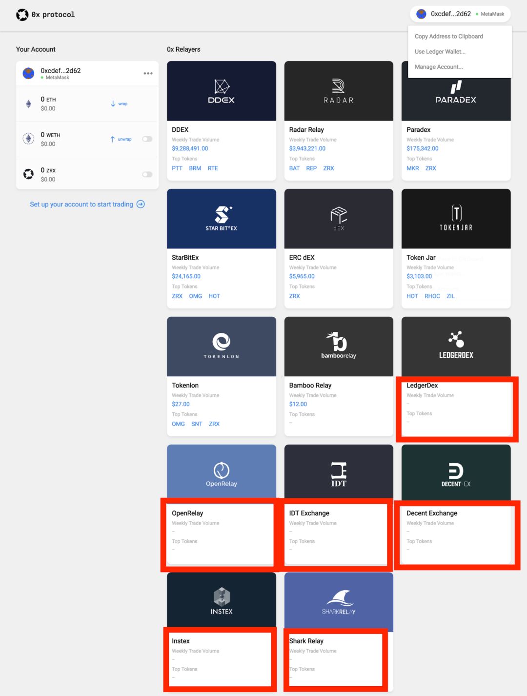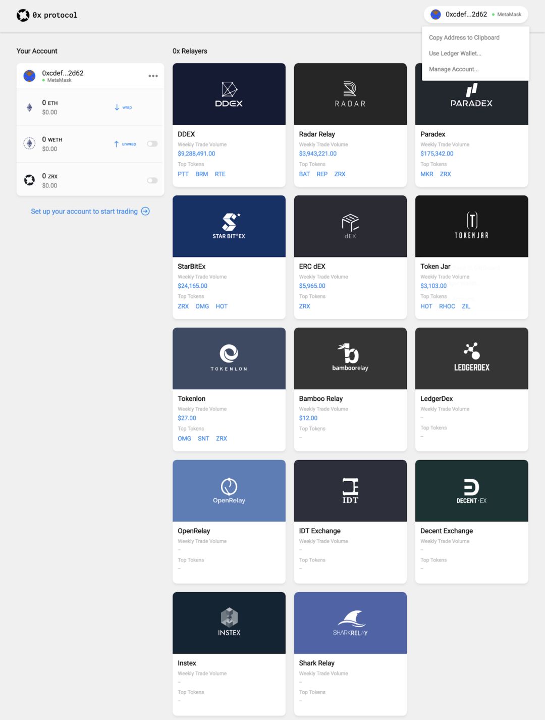 设置 0x 生态系统,而后可以进入其 portal 列出的所有支持 0x 协议的交易系统: