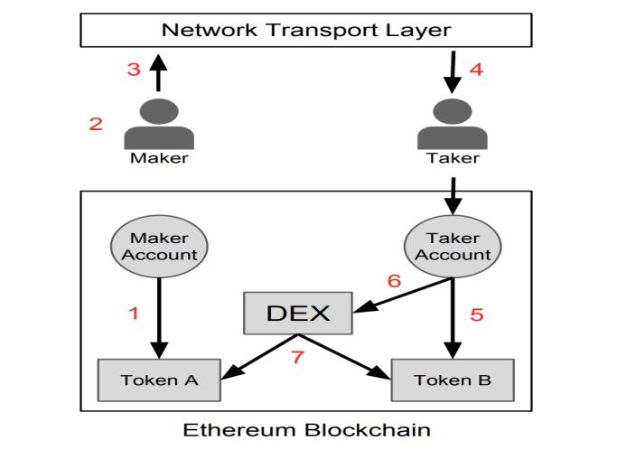 其中 2、3、4 部分只涉及信息的流通,也就是上面所说的 「链下订单中继」,然后交易以太坊智能合约系统执行。
