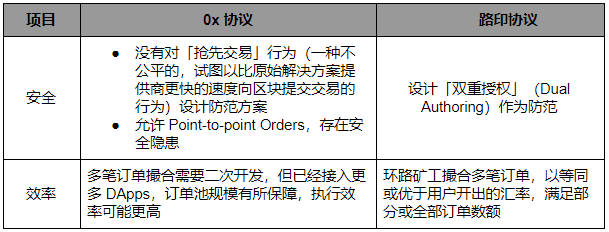 3. 缺少对「抢先交易」行为的防范机制、一对一(Point-to-point Orders)订单存在安全隐患。同作为去中心化交易所项目,0x 协议和标准共识之前分析过的「路印协议」(LRC)类似,都是去中心化交易所的解决方案、也都是「链上交易,链下撮合的机制」因此在分析项目风险的时候可以对比,主要仍为「安全」和「效率」两个维度,对比如下: