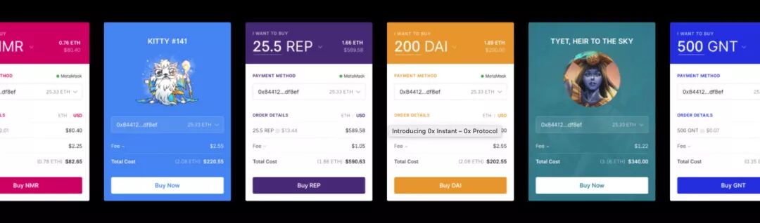 当你有效嵌入了Instant的代码,你的产品就相当于进入了0x的聚合流动的资产池中。0x的资产池接受符合ERC-20和ERC-721两种标准的数字资产。每当用户使用你的产品想进行数字货币交易时,Instant即会在0x流动性资产池网络中自动找到最优价格并且以ETH为基准货币换算价格提供给用户,用户即可通过MetaMask,Ledger,Trezor等第三方以太坊钱包完成交易即可。