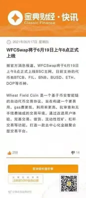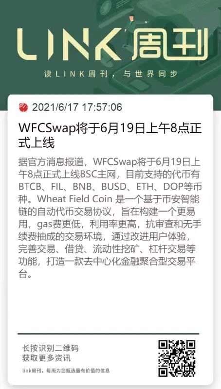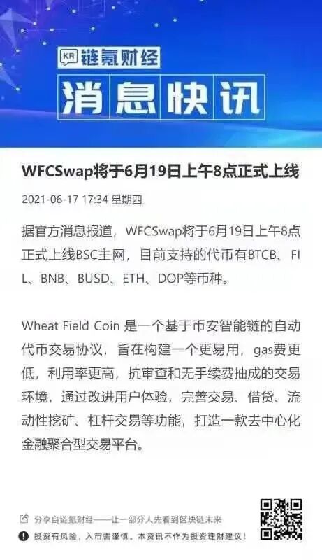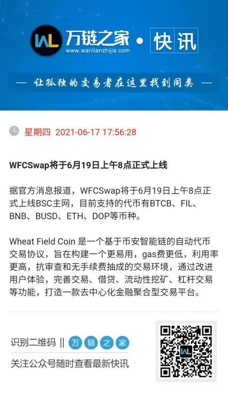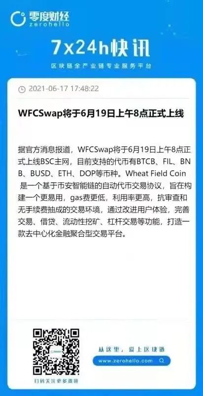 WFCSwap将于6月19日上午8点正式上线BSC主网,目前支持的代币有BTCB、FIL、BNB、BUSD、ETH、DOP等币种。