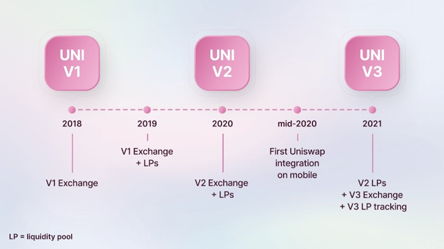Uniswap V4的升级之所以会引发众多机构的关注,一方面是美国证券交易委员会(SEC)对全球最大CEX币安起诉风波,让行业内机构开始对CEX的未来发展产生了担忧,而拥有去中心化和抗审核性的DEX无疑获得了更多的青睐。此外,最重要的一点是Uniswap 作为行业龙头,其推出的每个版本都引领了DEX的发展方向,被后继者争相模仿,也带动了整个DeFi繁荣发展。下面让我们来回顾一下Uniswap的每个历史版本。