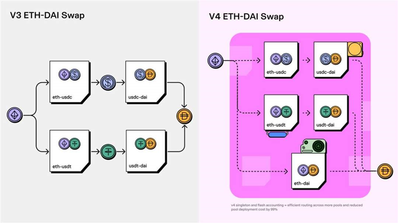 提高成本效率:Uniswap V4的Singleton架构可以将所有的LP合约都设置为了单一合约,此举不但可以降低创建LP和multi-hop trade(跨池路由交易)的Gas费用,还能极大提升了部署合约的效率。再加上闪电记账来降低频繁交易的成本,Uniswap V4帮助用户以最小化的成本实现最大化的效益或价值,同时也为DEX的可持续发展提供了更好的基础。