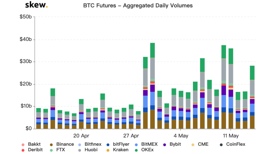 今年可以说是期货市场爆发之年,数字货币合约交易量大幅增长,根据 Skew 网站的数据,比特币合约近一周的每日交易量都在 150 亿美元以上,最高更是达到 370 亿美元左右。