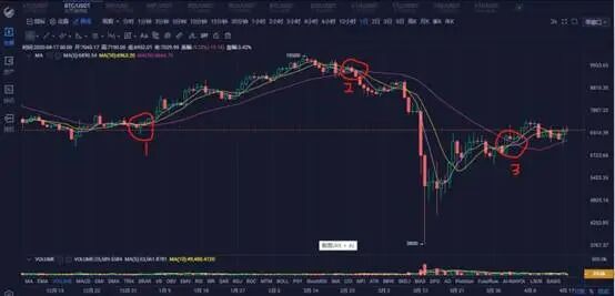 1、底部强力拉盘。BTC跌到4375美金的时候,美股期指熔断,比特币也跟着大跌。9点半美股开盘,开盘前8点的时候比特币就被巨大买单拉起来,然后回落,9点半美股开盘果然跌停,但是比特币却准时爆拉,恐慌中见了3800上来的次低点,这个8点的爆拉就是做多信号。