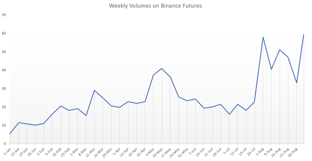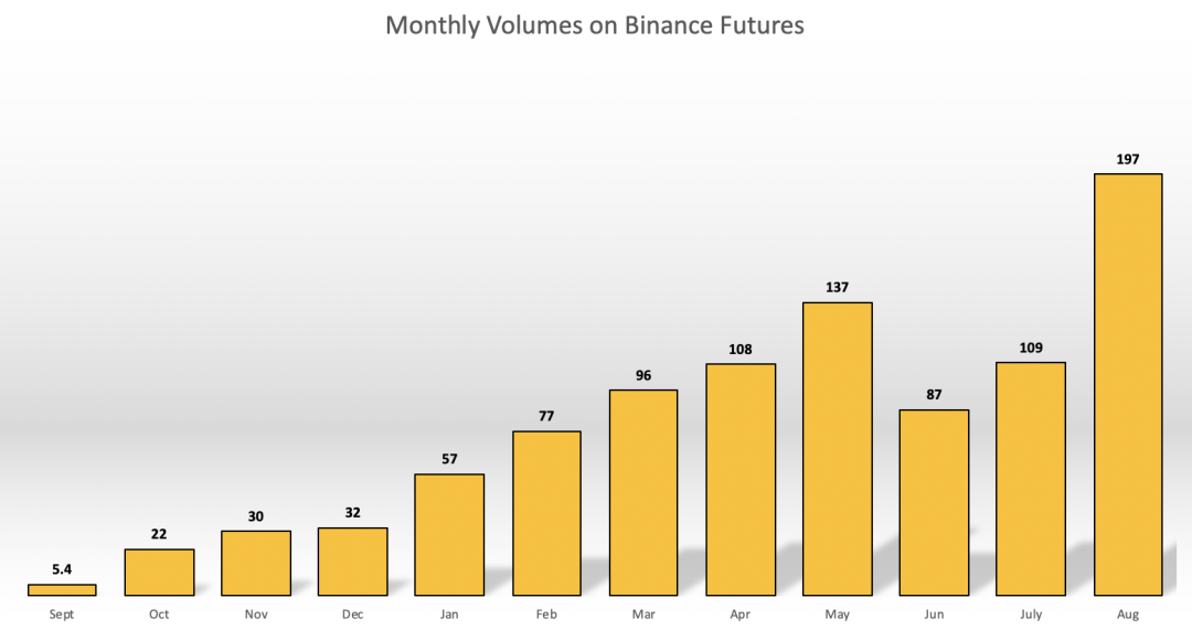 2019年9月币安合约运营第一天,我们就实现了19,253 BTC的交易量,折合合约价值1.7亿美元。此后,平台以指数式速度增长,今年8月日均交易量已达到60亿美元,与我们运营第一个月的总交易量相当。