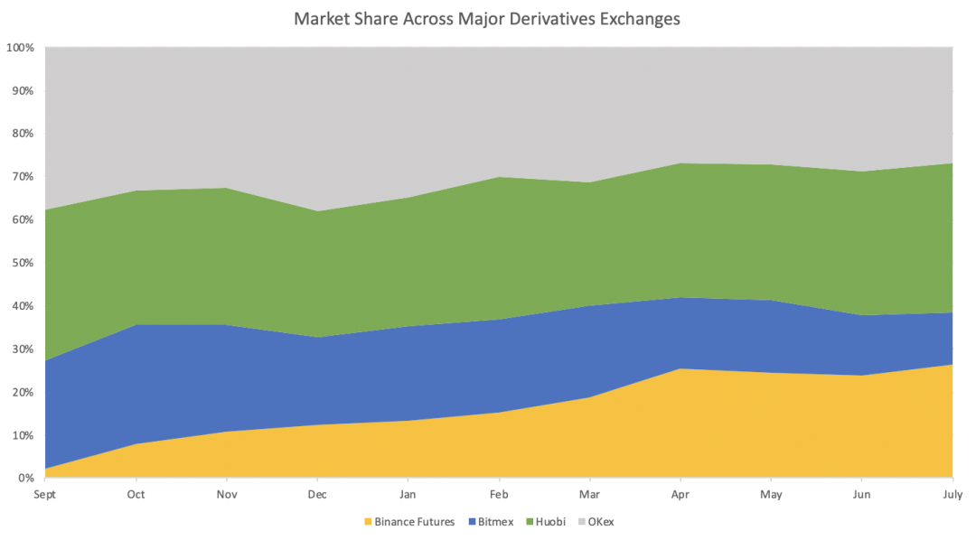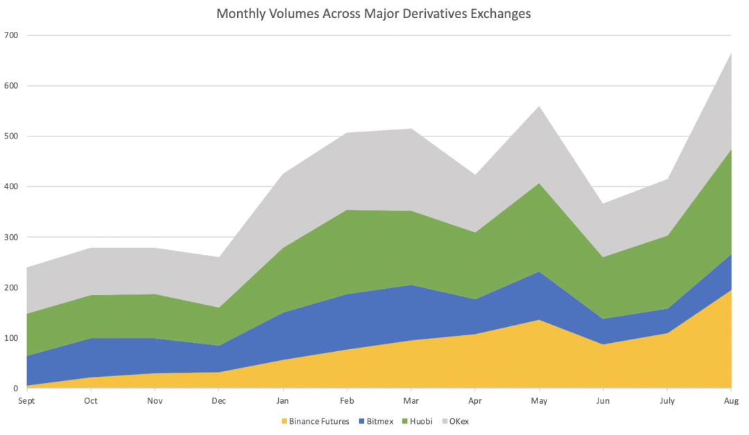 2019下半年,火币和币安合约交易平台迅速崛起,给衍生品市场带来了一群新用户。自此,市场开始发展,竞争变得激烈,散户和机构级参与者的大量需求也推高了交易量。