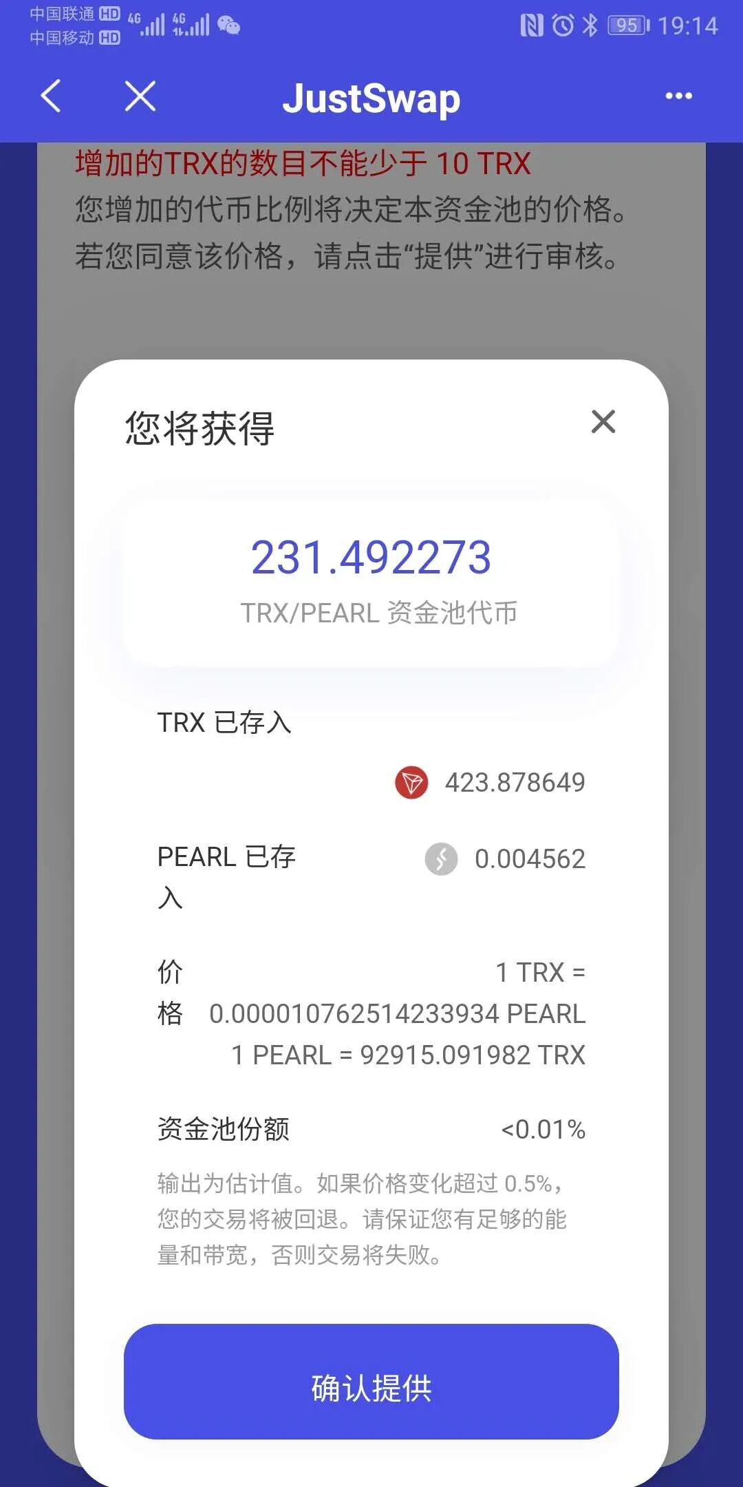 通过钱包或者网页进入justsawap页面,点击资金池,点击增加流动性选择PEARL,输入你能够提供的代币数量,TRX的数量会自动算出来。