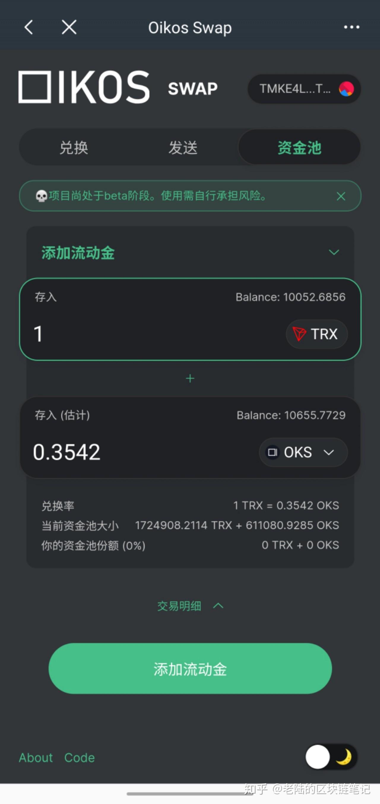 资金池是成对的,所以想添加 1 TRX ,也需要其他等额 1 TRX 的其他通证