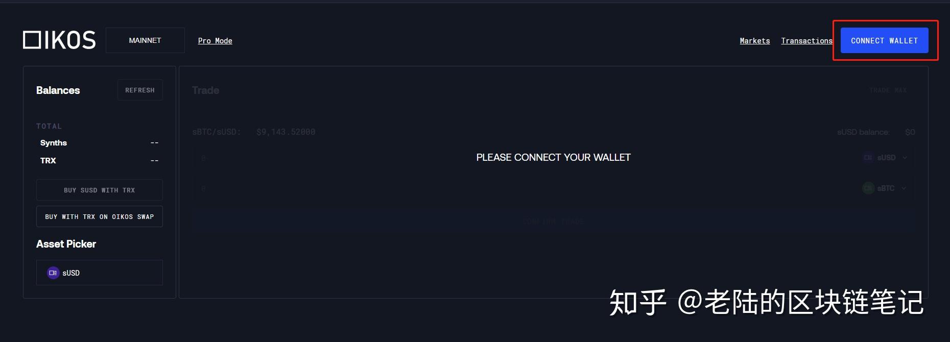 电脑打开交易平台网址:https://oikos.exchange/或在麦子钱包Dapp商店中打开 OIKOS Exchange,打开后点击右上角 Connect Wallet 授权钱包登录