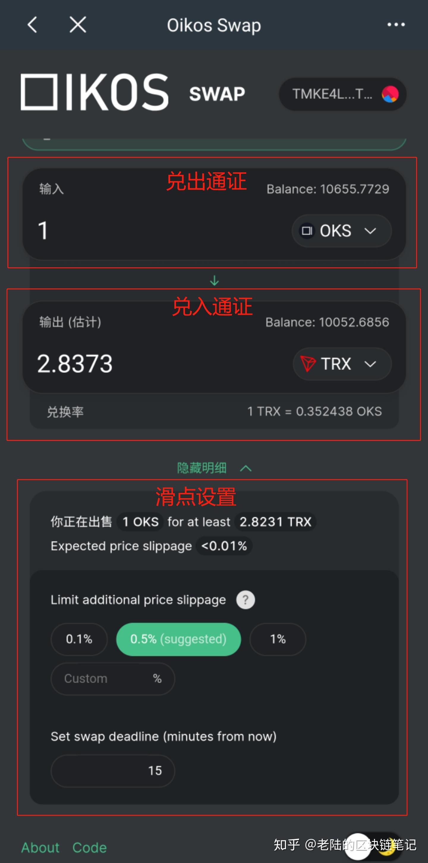 选择通证,输入为兑出通证,输出为兑入通证,如图所示,此时为将 1 OKS 兑换为 2.8373 OKS ,手续费为 0.03%