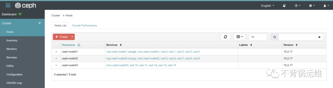 可以看到ceph集群已经有一个节点ceph-node01,它担任了mon、mgr的角色,在我的规划中,也是要让ceph-node01节点作为osd角色的,它的osd数量目前为0,接下来我们在ceph-node01上创建osd