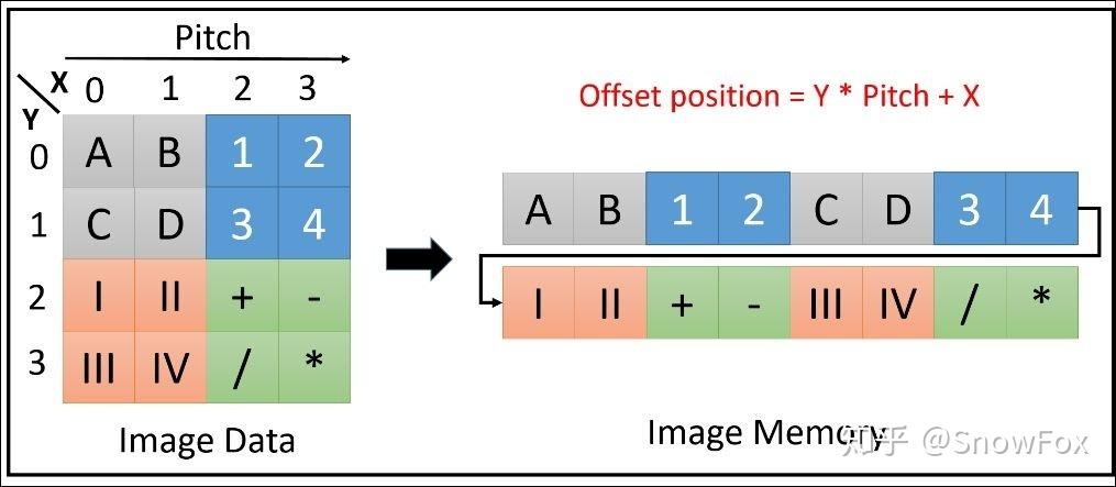 间距通常表示图像的宽度,通常而言,这个值可能比为了满足对齐要求而添加的填充字节要多。 给定纹理元素的位置偏移量可以使用其行位置和列位置以及给定的间距来计算,如前图所示。