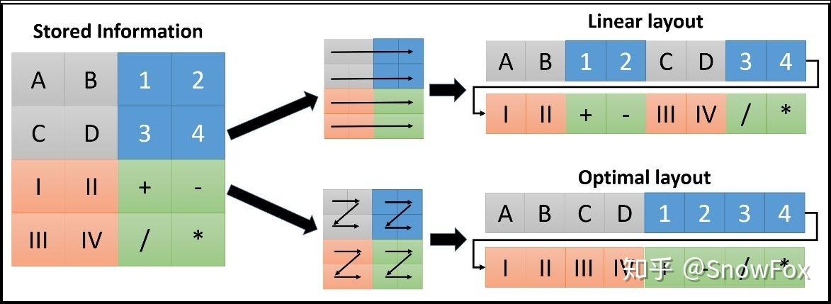 只要在沿“行”的地方访问纹素就不需要相邻的纹理信息,这种线性布局就是整齐紧凑的。 但是,一般来说,许多应用程序要求图像信息读取多行数据。 当图像尺寸较大时,线性布局中的行间距长度会增加并延伸到多行。 在多重缓存级别的系统中,这会导致性能下降,这是由于转化后备缓冲区translation lookaside buffer(TLB)和缓存未命中导致的地址转换较慢。