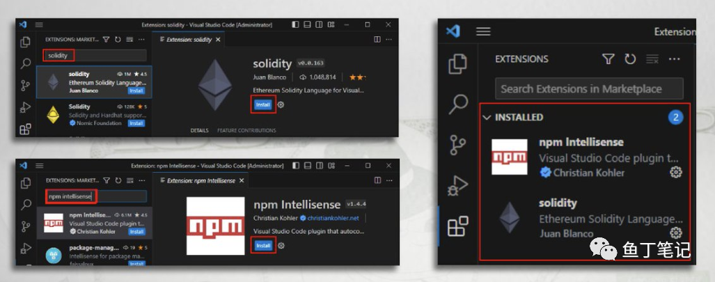 2、打开 VisualStudio 并安装扩展 – Solidity + npm Intellisense