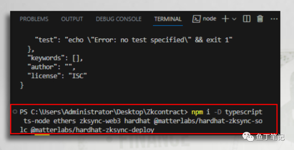 6、按下“Ctrl+ù”打开终端并输入“npm init -y”。然后输入“npm i -D typescript ts-node ethers zksync-web3 hardhat @matterlabs/hardhat-zksync-solc @matterlabs/hardhat-zksync-deploy”。