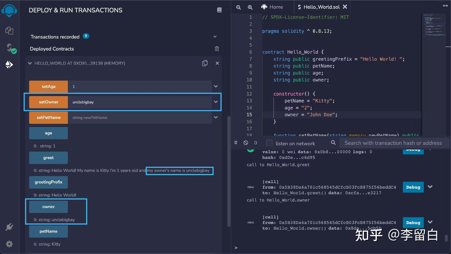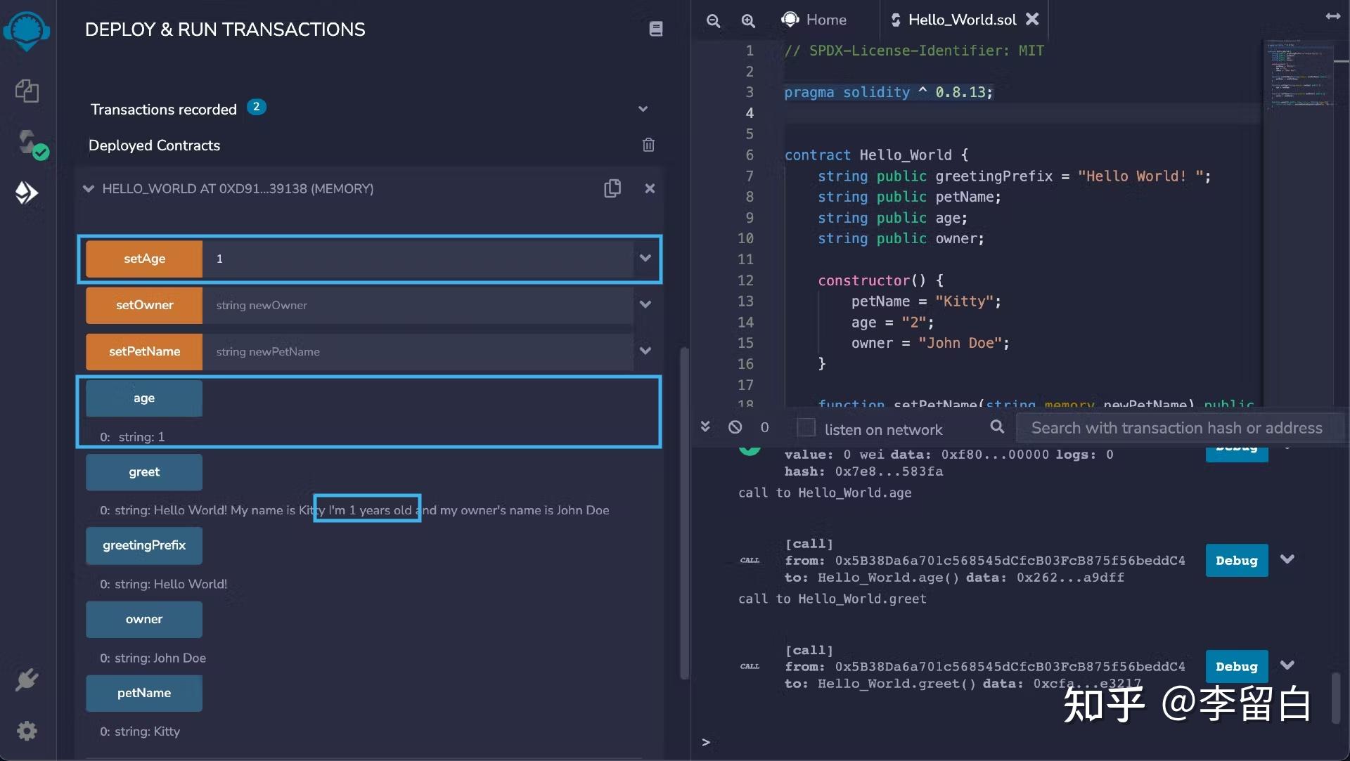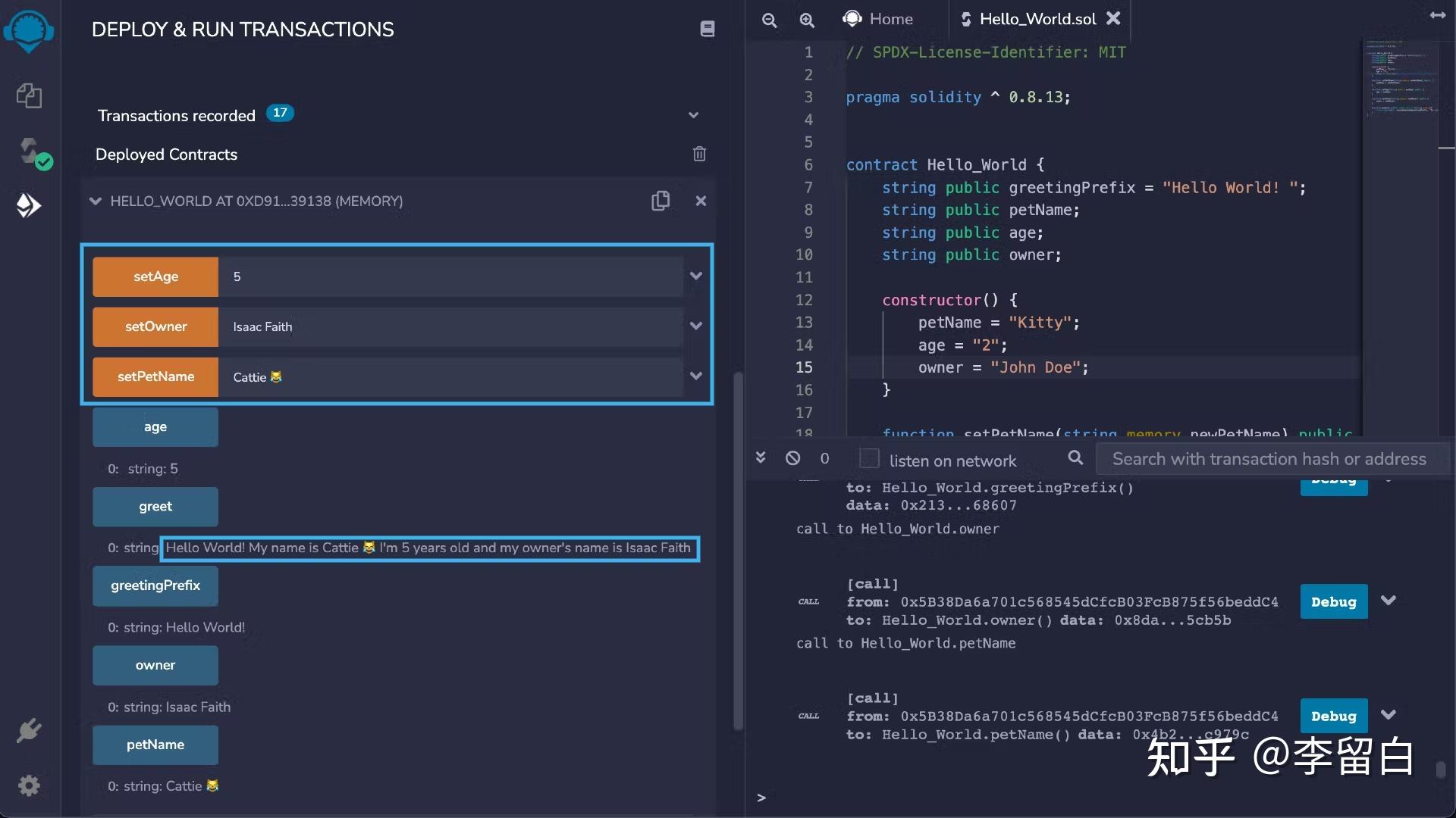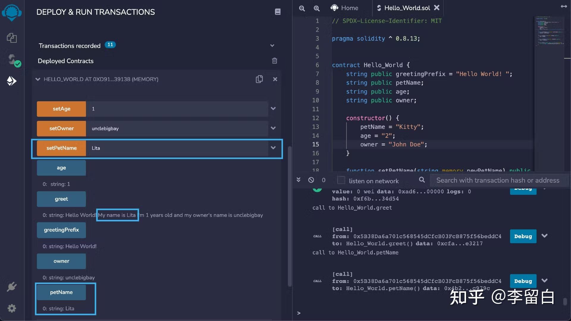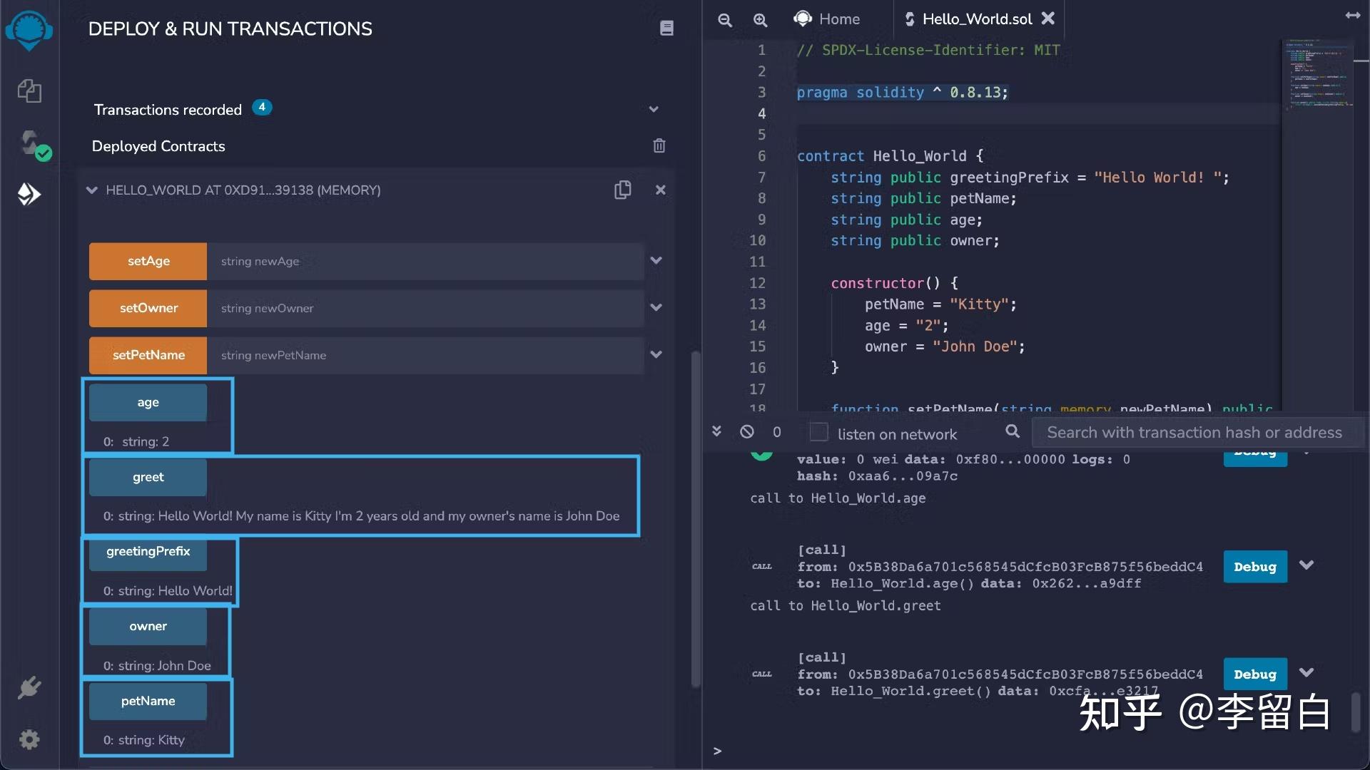 在上面的代码中,我们将智能合约的状态变量(petName, age, 和owner )声明为字符串。然后我们在构造函数中为状态变量设置一个初始值。