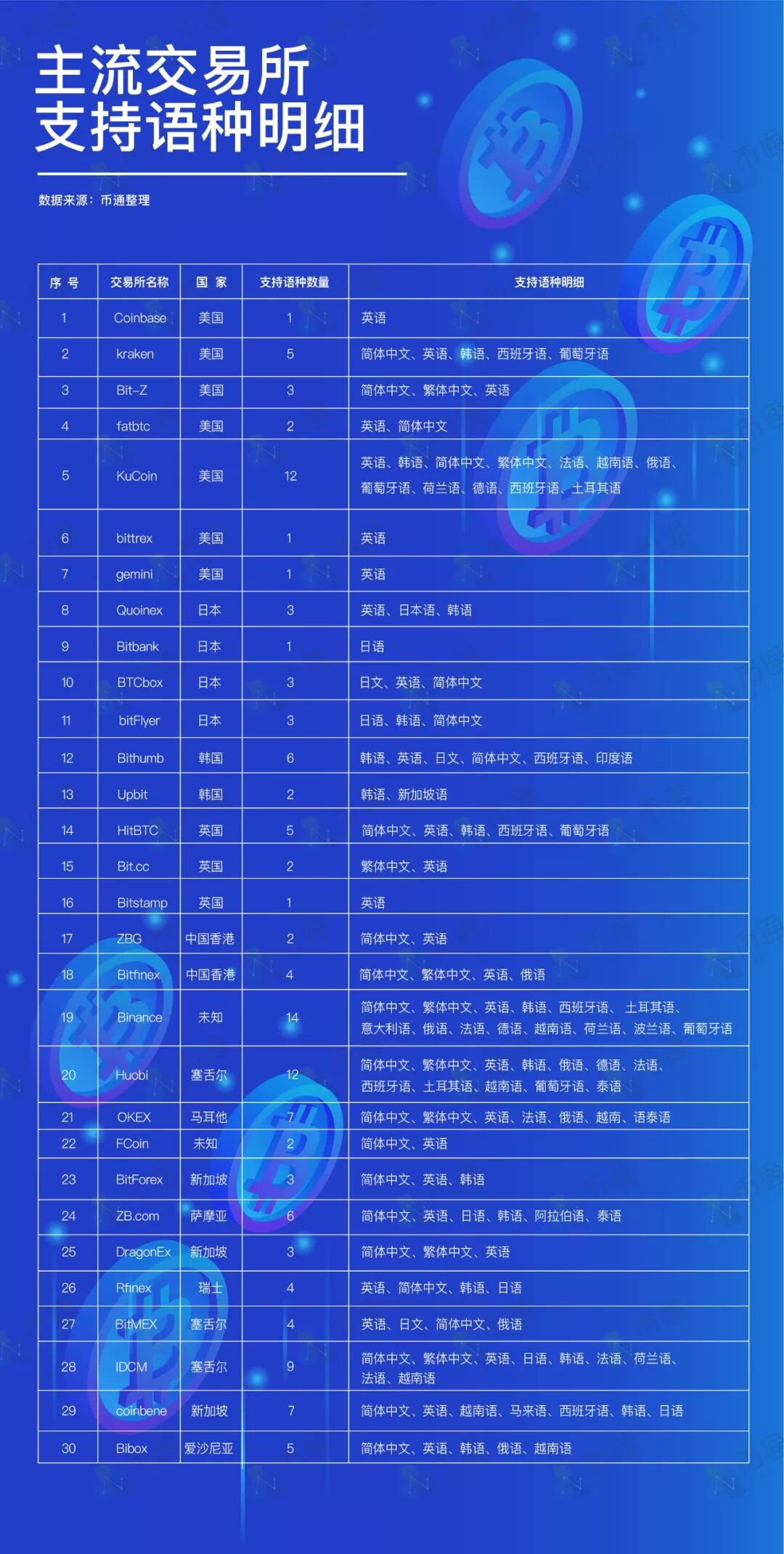 2.支持语种数量越多的交易所,其用户来源越广泛,全球化水平越高;