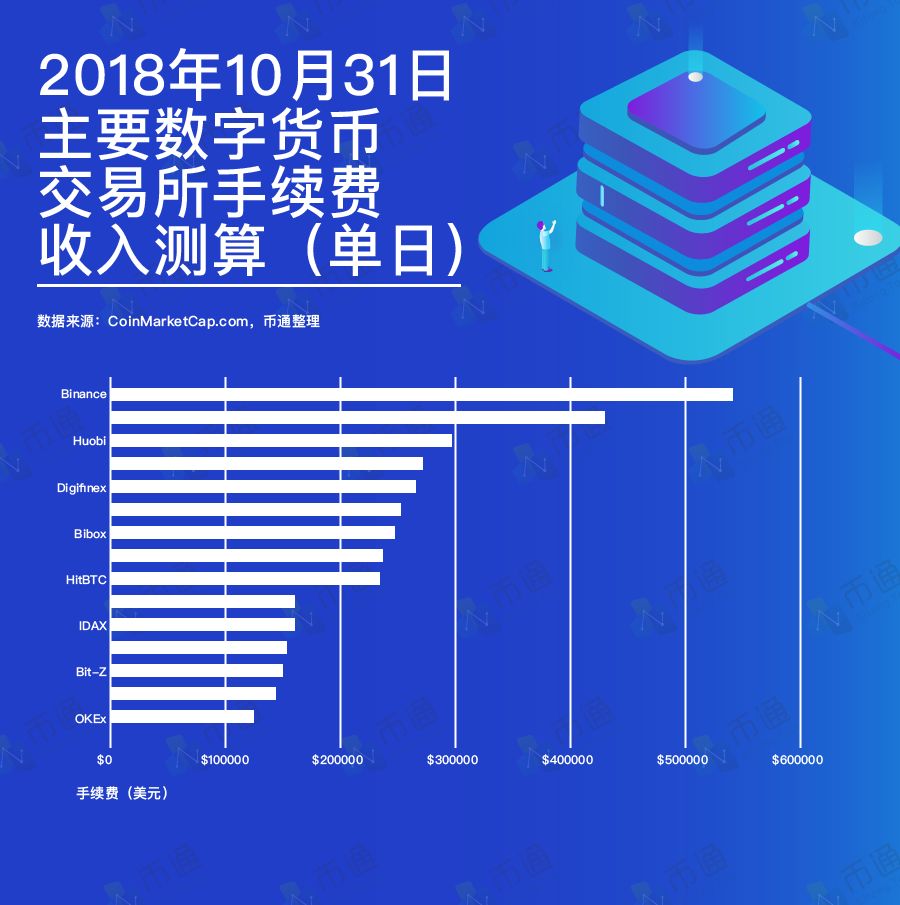 币通研究团队在假定各家交易所手续费统一为0.1%的前提下,根据各交易所2018年10月31日的交易数据对手续费收入进行了测算。结果发现,币安、火币等大型交易所单日手续费收入超40万美元,仅手续费一项,每年就产生近2亿美元的营业收入,收益极为可观。