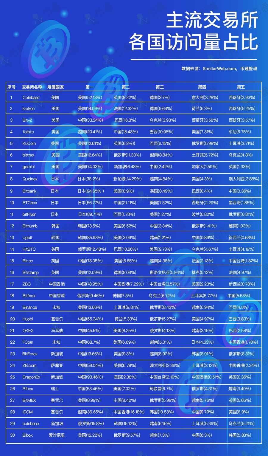 币通对全球主流的30家数字货币交易所的用户来源进行分析后发现: