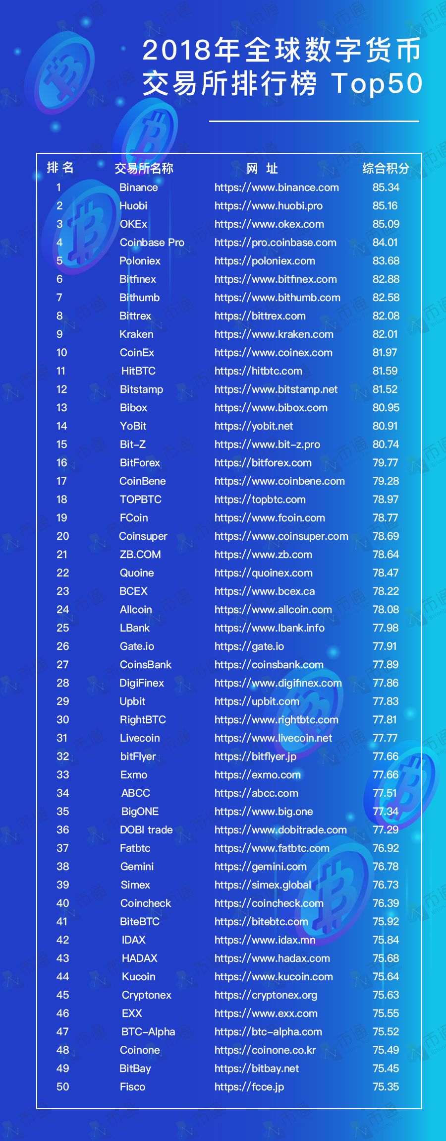 币通榜单 | 2018年全球数字货币交易所排行榜Top50