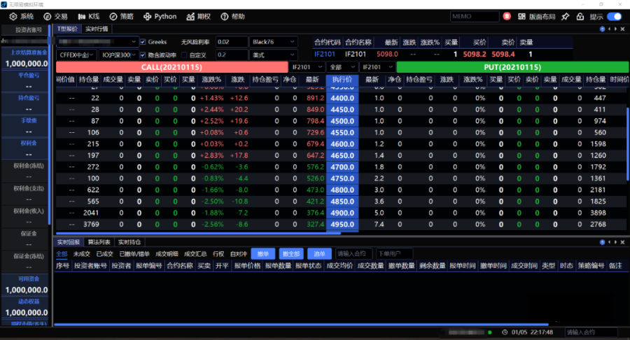 另提供用户根据市场情况自组期权下单交易并实时显示盈亏图、风险分析、希腊值参考等。下单方面,支持鼠标点击T型报价表和标的期货列呼出下单盒下单,止盈止损功能嵌套在下单盒内。