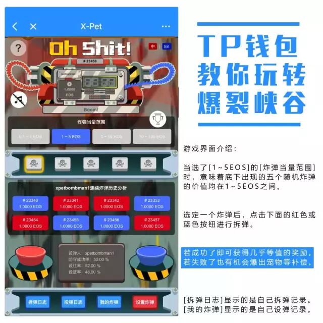 设炸弹需要支付等值的EOS,拆弹也需要抵押等量的EOS。