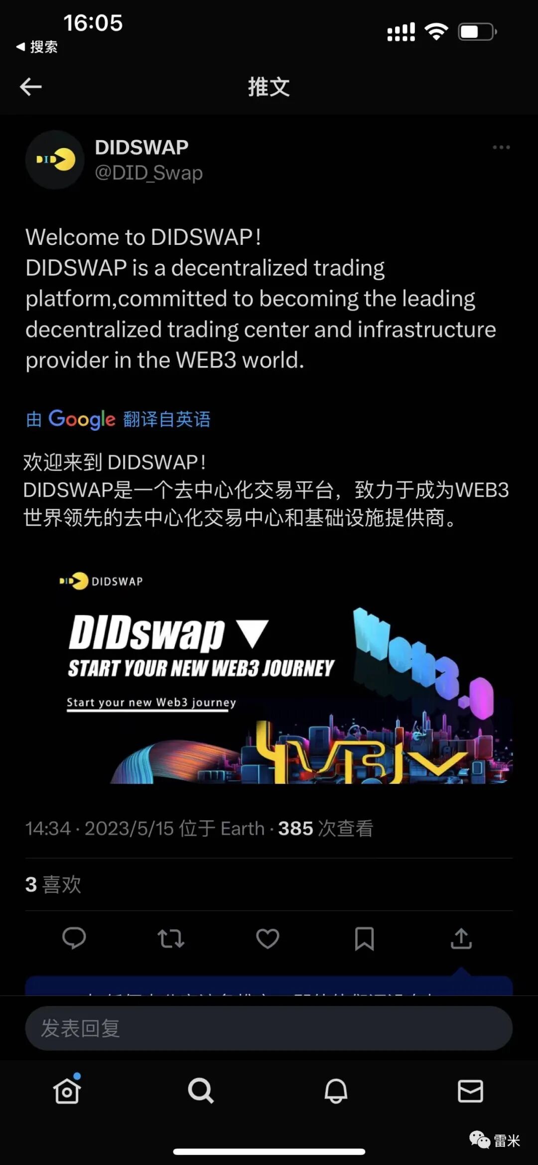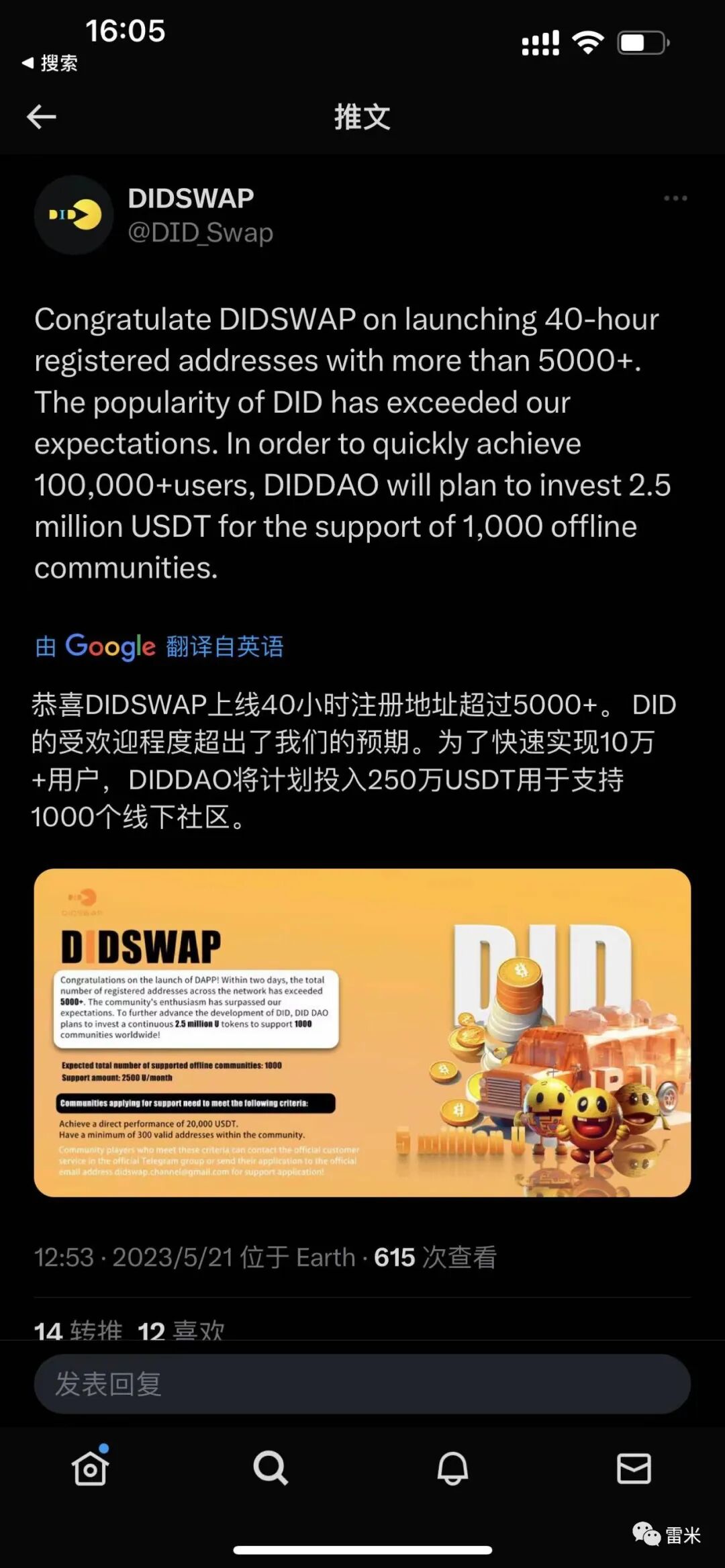 DIDSWAP 在5月15日开始发出第一个推特宣传成立DIDSWAP。