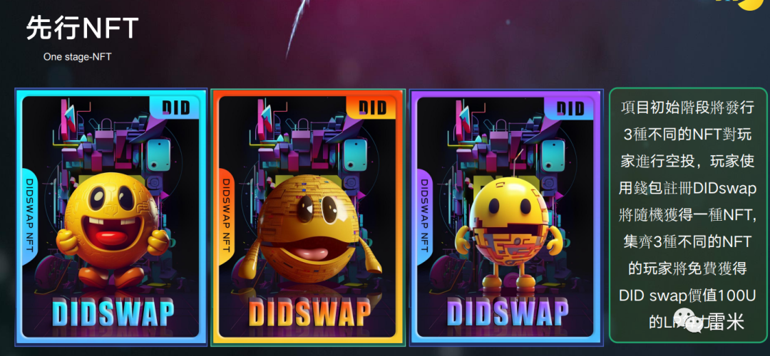 项目方初始阶段发行3种不同的NFT给玩家进行空投,玩家使用钱包主册DIDswap将随机获得一千NFT,集效3种不同的NFT的玩家将免费获得DID swap價值100u的LP算力。