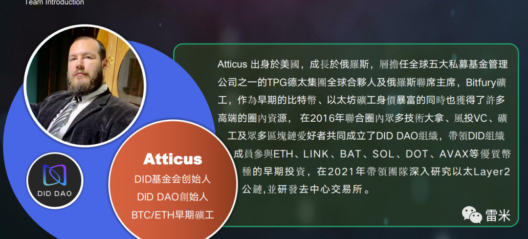 创始人:Atticus 是DID基金会创始人 DID DAO創始人 BTC/ETH早期礦工
