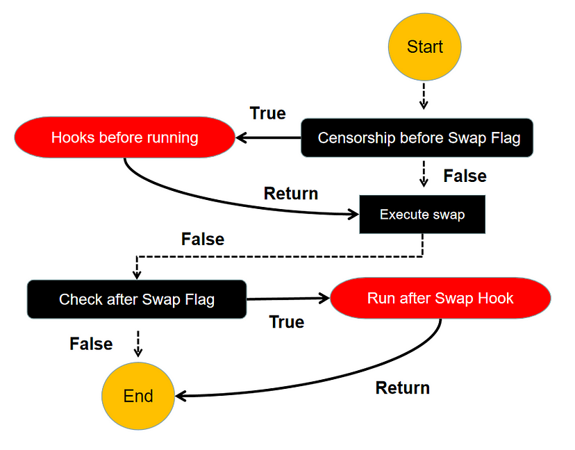 Uniswap V4 版本中除了 Hooks 外,还存在着另一个 “Action Hooks” 。它只有在满足 Flag 条件时才能触发运行合约,因此它可在合约执行期间调用逻辑。参考下面流程图来解释说明,在我们资产交换之前,合约需检查 Flag 以此来评估流动性池的波动性,如果流动性很高,Flag 会变成 True 并运行执行我们的 Hooks,如果流动性不足,Flag 会变成 False 从而拒绝 Hooks 保持交互不变,通过如下图示执行操作 “Action Hooks” 则启用了一种更为节省 Gas 的方法来执行我们所需要的 Hooks,接下来将介绍 Singleton 结构和 Flash accounting 将在 V4 中实现更加便宜的资产交换和合约部署体验。