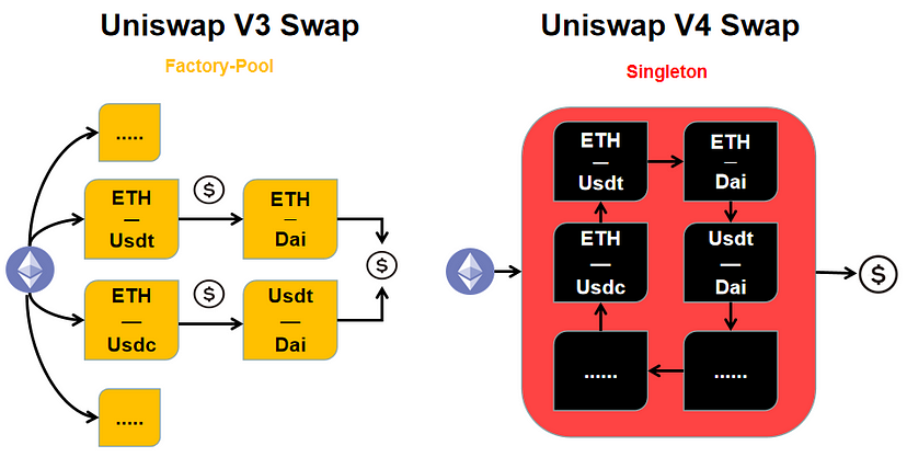 – 减少费用和提高效率:Uniswap V4 的架构通过引入”Singleton” 合约,将所有流动性池集中在一个智能合约中。这种架构可以减少交易的成本,提高交易的效率,同时简化合约的部署和维护。此外,定制化流动性池还可以根据具体需求设置更适合的费用结构,以满足不同用户的需求。